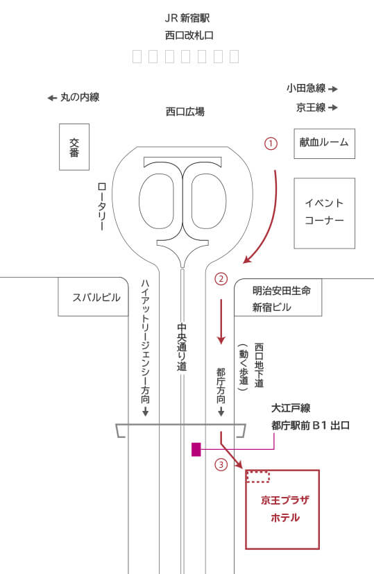 - ② 西口地下道より中央通りを都庁方面に直進。
